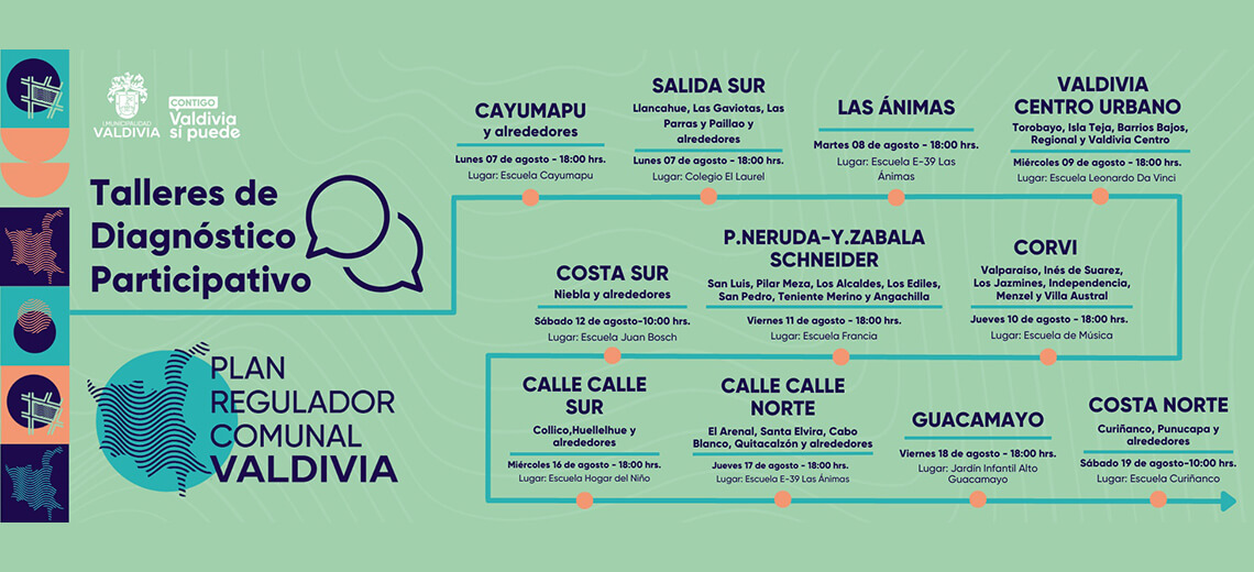 Así, los primeros talleres participativos se iniciarán este lunes 7 de agosto, a las 18 horas, en el sector rural de Cayumapu y alrededores. Aquí, la reunión se realizará en la Escuela Cayumapu. De forma paralela, en la salida sur de la ciudad, se convoca a los habitantes de Llancahue, Las Gaviotas, Las Parras, Paillao y entorno. El lugar de la jornada será en la Escuela Los Laureles.
