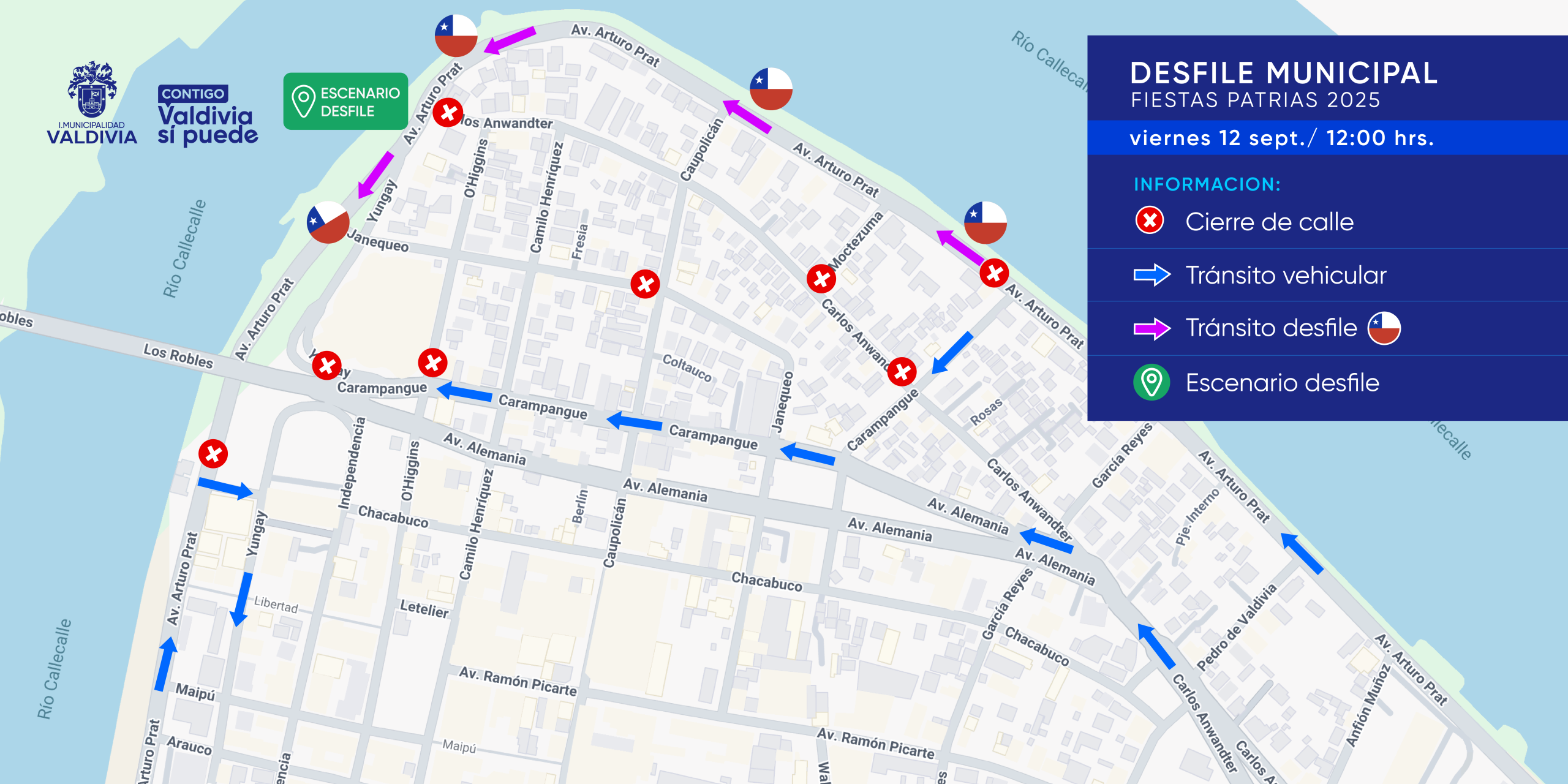 De esta forma, habrá cortes de tránsito por cierre de calles en Avenida Arturo Prat en su intersección con Carampangue; Carampangue con Carlos Anwandter; Carlos Anwandter con Moctezuma; Janequeo con Caupolicán, Carlos Anwandter con Arturo Prat; O’ Higgins con Carampangue, y Carampangue llegando a Yungay. Por su parte, el escenario del desfile estará ubicado en Avenida Arturo Prat con Carlos Anwandter (altura Almacén Fluvial).