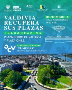 La Municipalidad de Valdivia confirmó que el próximo domingo 21 de diciembre, a las 19:00 horas, se realizará la inauguración de las renovadas plazas Pedro de Valdivia y Plaza Chile. La actividad, abierta a toda la comunidad, incluirá el concierto navideño “El Mesías” de la Orquesta de Cámara de Valdivia, en calle Independencia.