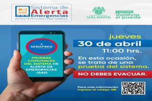 En el marco de las pruebas comunales del Sistema de Alerta de Emergencias (SAE) liderado por Senapred en conjunto con la Municipalidad de Valdivia, este jueves 30 de abril, a las 11 horas, en la capital regional de Los Ríos se activará en los teléfonos celulares una alarma de ensayo para verificar el funcionamiento del sistema.