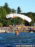 jueves, 17 de febrero de 2005——————. Los días 17, 18 y 19 de febrero se realizará el XVI Campeonato de Paracaidismo de Precisión en el Agua, evento deportivo organizado por Skydivepucón y el Club Deportivo “Aguilas”, con el apoyo de la Municipalidad de Valdivia. El campeonato – que se desarrollará estos días entre las 17 y 19:30 horas - es un evento único en el mundo, y su particularidad reside en que los deportistas deben aterrizar e intentar llegar al centro de una diana flotante ubicada en medio del río Calle Calle. La diana flotante está compuesta de una cámara central y otras seis adosadas a su alrededor y que tiene diferentes puntuaciones dependiendo del sector donde primero toque cada paracaidista. Cada paracaidista realizará un salto diario, sumando un total de tres durante el evento. La puntuación de cada salto será sumada y totalizada el último día de la competencia. El mayor puntaje por salto es 0 (cero) y corresponde a aterrizar en el centro de la diana flotante. El puntaje más bajo por salto es 18 (dieciocho) y será asignado al paracaidista que aterrice en tierra, el que -a la vez- quedará descalificado automáticamente del campeonato. La calificación que obtenga cada participante corresponderá al lugar donde descienda. De esta forma, mientras más cerca aterrice en el centro de la diana, menor será el puntaje numérico y en mejor lugar de clasificación se mantendrá. La inscripción tendrá un valor de 20 mil pesos para todos los competidores. En el caso de que se junten cuatro o más mujeres participantes, se hará una competencia femenina por separado, y se premiarán a 2 de 4 o más competidoras. En la modalidad varones se premiarán a los 3 primeros individuales masculinos. Para aquellos que no compitan y deseen hacer saltos libres, fuera de competencia, deberán cancelar una inscripción de 10 mil pesos. Además, deberán cancelar cada uno de sus saltos. Para la realización de los saltos se utilizarán aviones Cessna 180, con capacidad para 4 paracaidistas por vuelo. Los saltos se harán de a 2 competidores por pase, entre 3.500 y 3.200 pies del río Calle-Calle. Año tras año llegan hasta la ciudad de los ríos avezados deportistas de todo el país, y el extranjero, para desafiar esta singular competencia que ha ganado un importante espacio entre los fanáticos del paracaidismo. Subir |