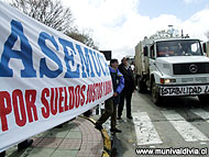 A eso de las 11:30 horas de esta mañana, una veintena de camiones y un centenar de funcionarios del edificio principal de calle Independencia salieron al frontis con lienzos y pancartas para sensibilizar a la comunidad sobre sus demandas.