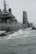 De inmediato la tripulación del remolcador efectuó la maniobra denominada de abarloamiento; es decir, apostó y aseguró con amarras al submarino a una de sus bandas o costado (estribor), quedando ambas naves a la gira y fondeadas en la bahía, a unos tres kilómetros y medio de distancia del muelle de la portuaria.