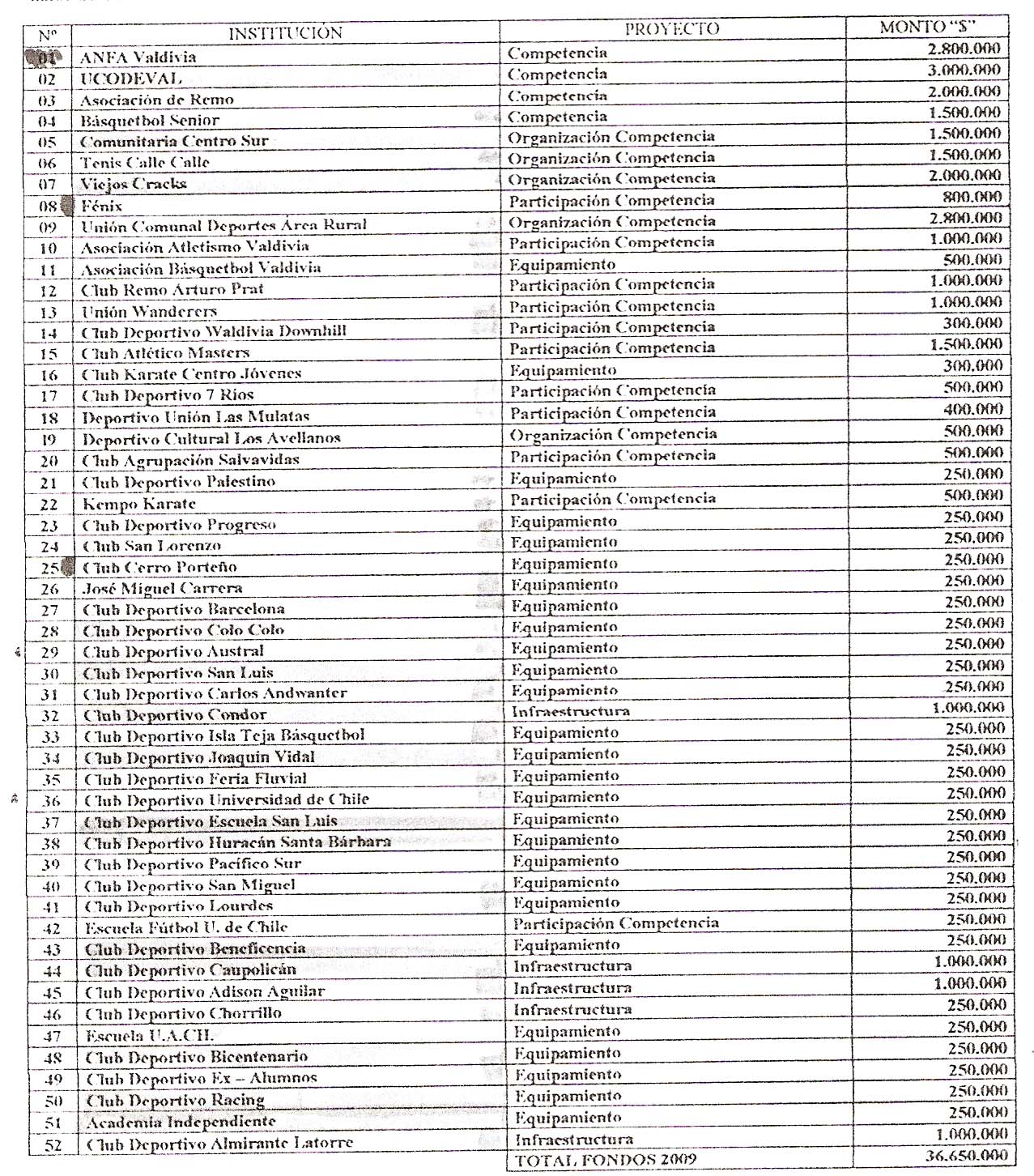miércoles, 06 de mayo de 2009—————. Este sábado a las 12 horas en la Sala Provincia de Valdivia se realizará la ceremonia de entrega de recursos del Fondo deportivo Municipal que ejecuta la Municipalidad de Valdivia. El fondo, de carácter concursable, fue creado el año pasado con la idea de fomentar, apoyar y promover el deporte amateur que se desarrolla en la comuna, y de paso ordenar y optimizar los resultados de los aportes que entrega la corporación para la actividad deportiva. Se distribuye en tres líneas de asignación: equipamiento, infraestructura y competencias. Este año se repartirán 36 millones 650 mil pesos, entre 55 organizaciones deportivas de Valdivia que fueron seleccionadas. Las condiciones para participar eran tener personería jurídica relacionada con la actividad deportiva, con asiento en la comuna y estar operativos. “En esta segunda versión hemos crecido significativamente con respecto al anterior período. Por ejemplo, el 2008 se entregaron casi 30 millones de pesos para 45 instituciones, por lo que en esta ocasión es más que evidente el aumento tanto de la cobertura como de los recursos”, dijo al respecto el alcalde Bernardo Berger. Entre los ganadores figuran Anfa, Ucodeval, la Asociación de Remo, Básquetbol seniors, Liga Costera Niebla, Deportivo San Luis, entre otros. El listado completo de los beneficiarios pude revisarse el sitio web www.munivaldivia.cl . |